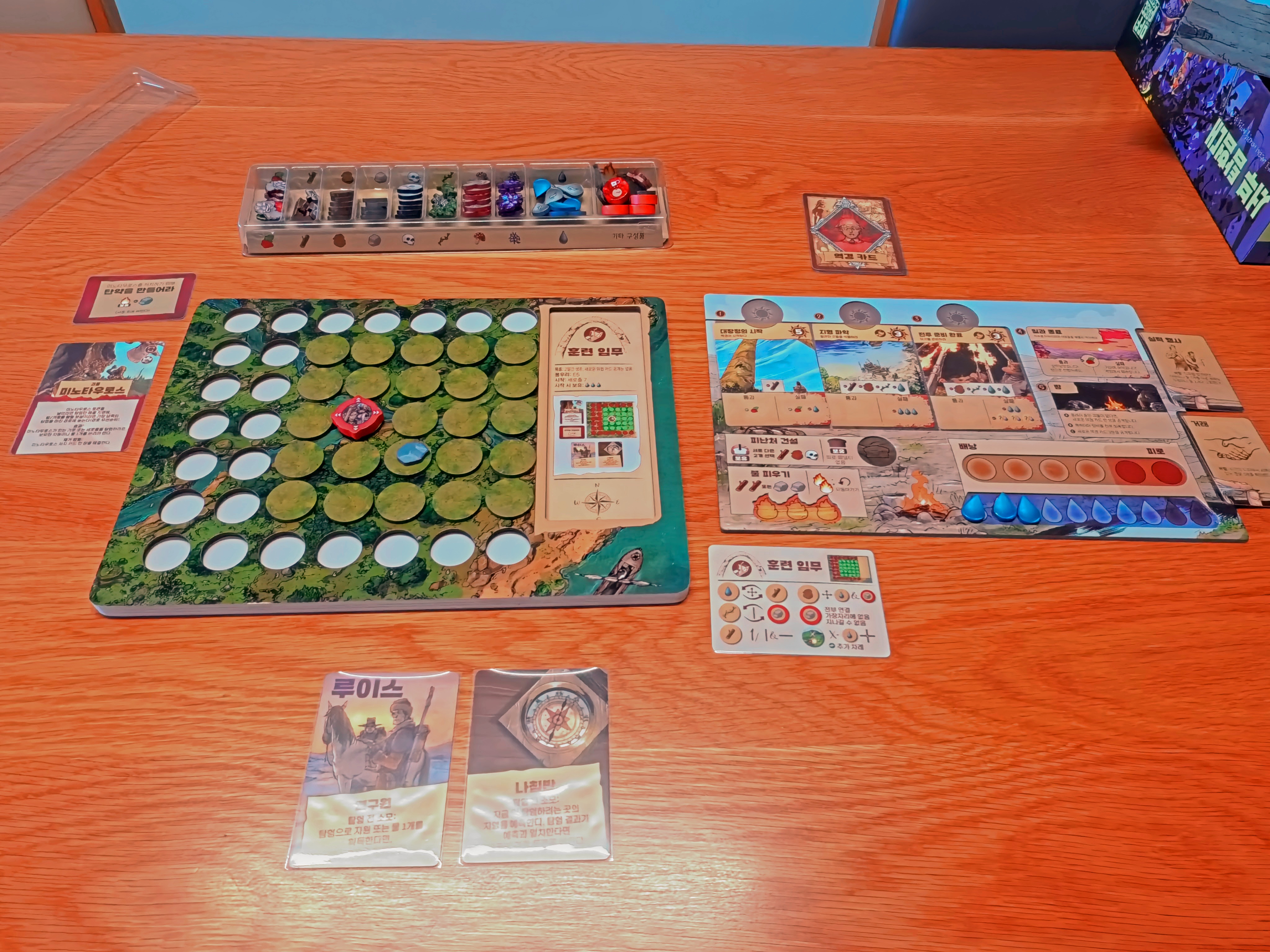돌아가면서 지형타일을 개방하고 해당되는 아이템을 얻어서 역경을 헤쳐나가는 그런 류의 게임인데 보드판의 지형이 배치되어 있는 규칙들이 있어서 스도쿠나 지뢰찾기 느낌이 많이 난다고 합니다.
