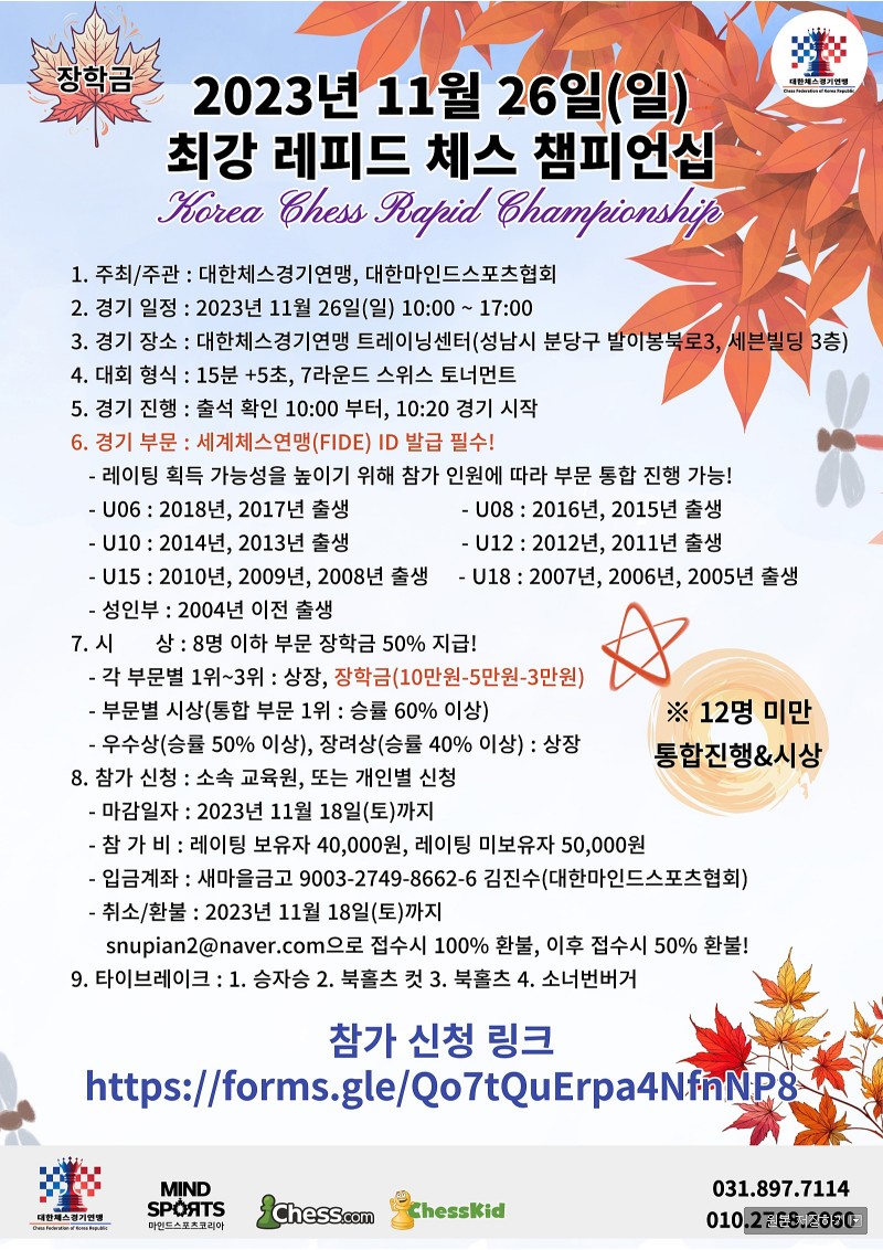 | 2023 코리아 최강 레피드 체스 챔피언십(11월 26일) 참가 후기 (2) | 2023.11.27 |