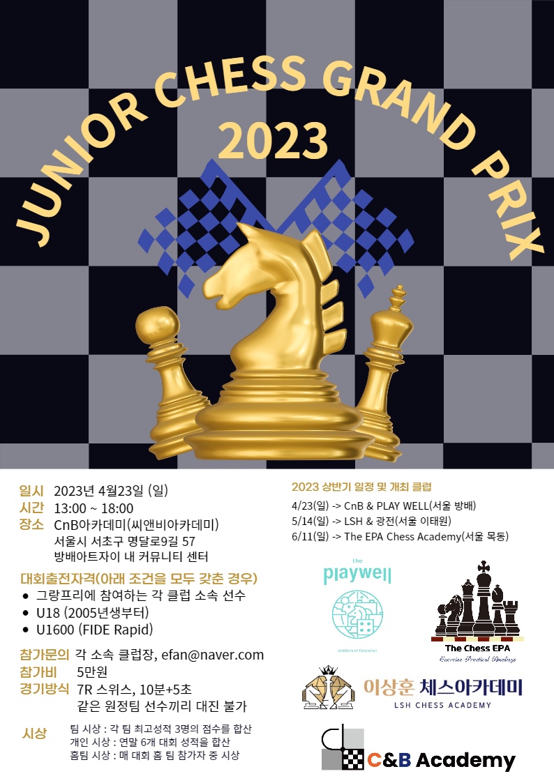 바로 이 대회인데요 주니어 체스 그랑프리 라는 대회입니다. 4개의 학원이 교류전을 가지는 방식이고 각 학원은 매 대회 상위 3명의 승점을 합해서 그 점수로 순위를 메기는 단체전 형식입니다.